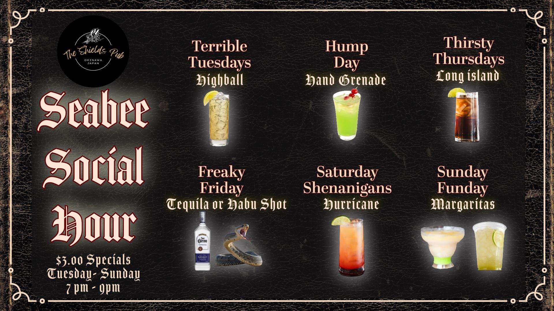 Seabee Social Hour: TUESDAYS- SUNDAYS 7PM-9PM - See the daily specials HERE