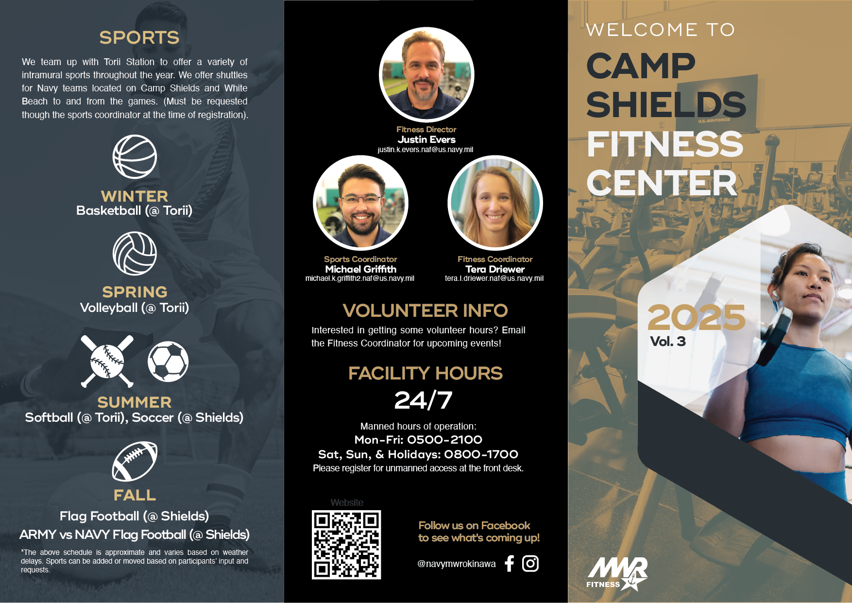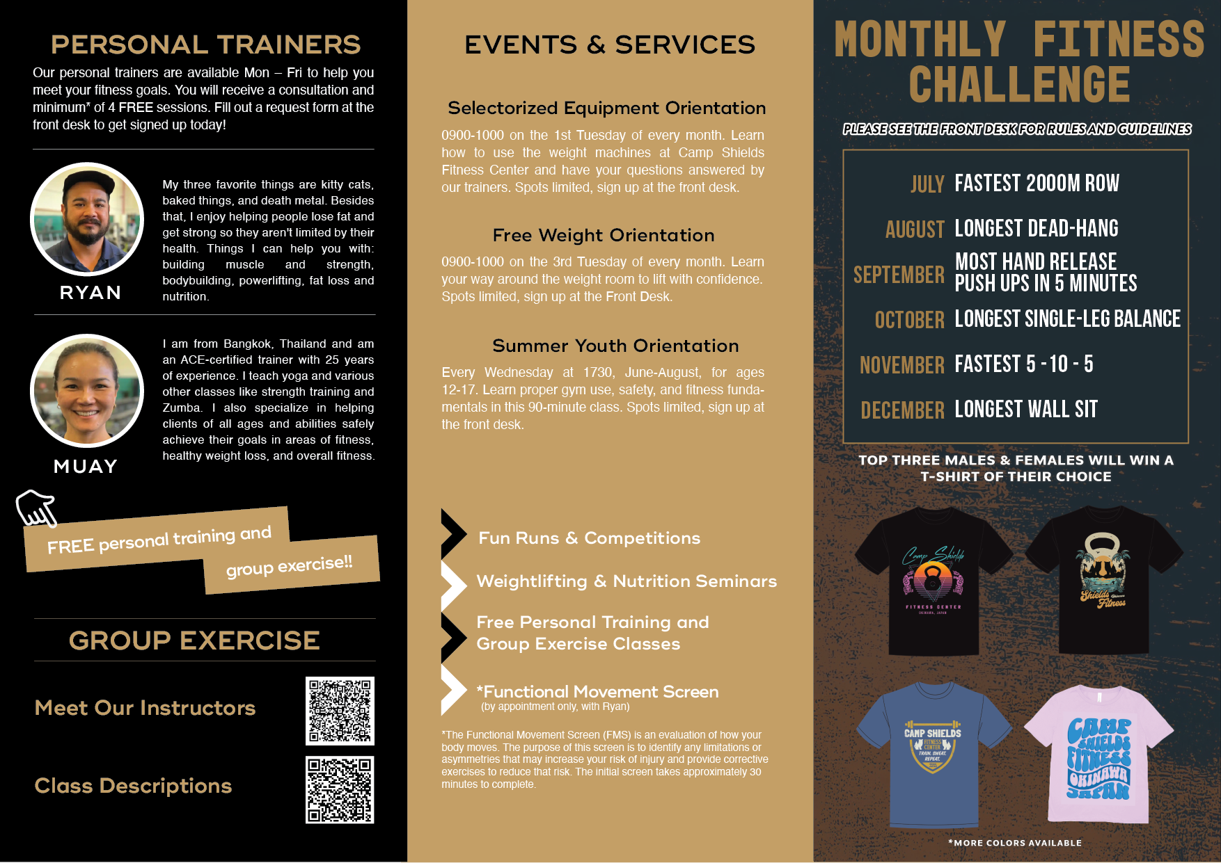 The Camp Shields Fitness Center provides a full range of services including a weight room, cardio room, sauna, outdoor workout pad, and a group exercise room. Our facility hosts free group exercise classes six days a week, and free personal training to all patrons upon request to help you achieve your fitness goals. We hold regular fitness events and challenges to keep you motivated, as well as a variety of sports throughout the year.